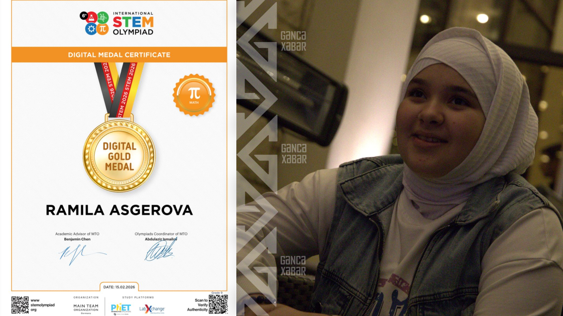 Gencexeber.az-ın məlumatına görə, Gəncə Dünya Məktəbinin 9-cu sinif şagirdi Ramilə Əsgərova beynəlxalq STEM (Science, Technology, Engineering, Mathematics - Elm, Texnologiya, Mühəndislik və Riyaziyyat) olimpiadasında qızıl medala layiq görülüb.