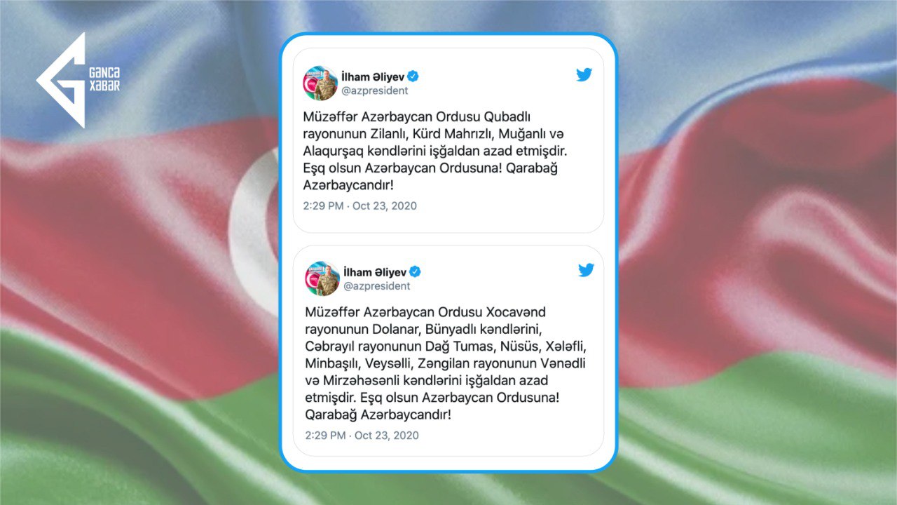 Gencexeber.az məlumat verir ki, 23 oktyabr 2020-ci ildə Xocavənd rayonunun Dolanlar, Bünyadlı, Cəbrayıl rayonunun Dağ Tumas, Nüsüs, Xələfli, Minbaşılı, Veysəlli, Zəngilan rayonunun Vənədli, Mirzəhəsənli, Qubadlı rayonunun Zilanlı, Kürd Mahrızlı, Muğanlı və Alaqurşaq kəndləri işğaldan azad edilib.