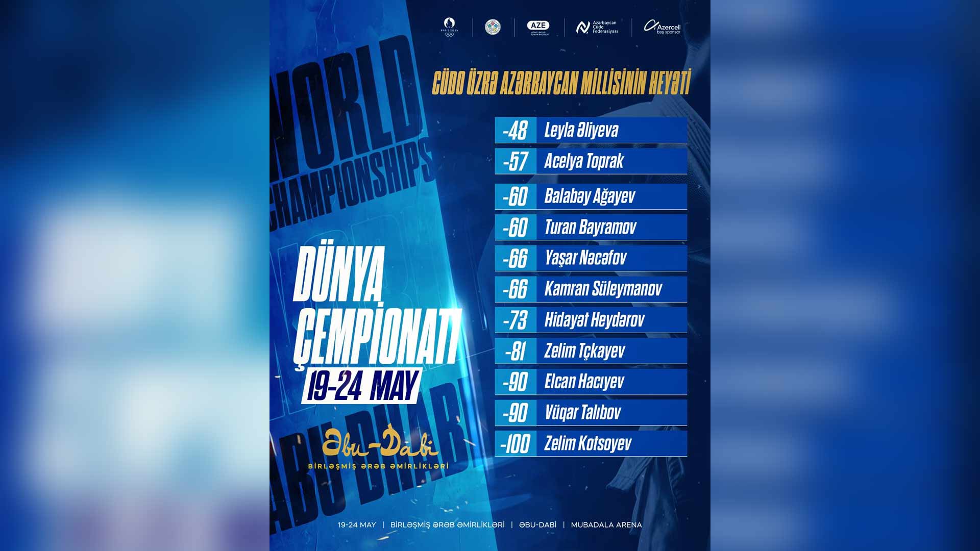 19-24 may tarixlərində Birləşmiş Ərəb Əmirliklərində cüdo üzrə dünya çempionatı keçiriləcək. 100-dən çox ölkədən 700-ə yaxın idmançının iştirak edəcəyi çempionatda Azərbaycan cüdo üzrə milli yığma komandası 8 çəki dərəsində 9 kişi və 2 qadın ilə təmsil olunacaq.