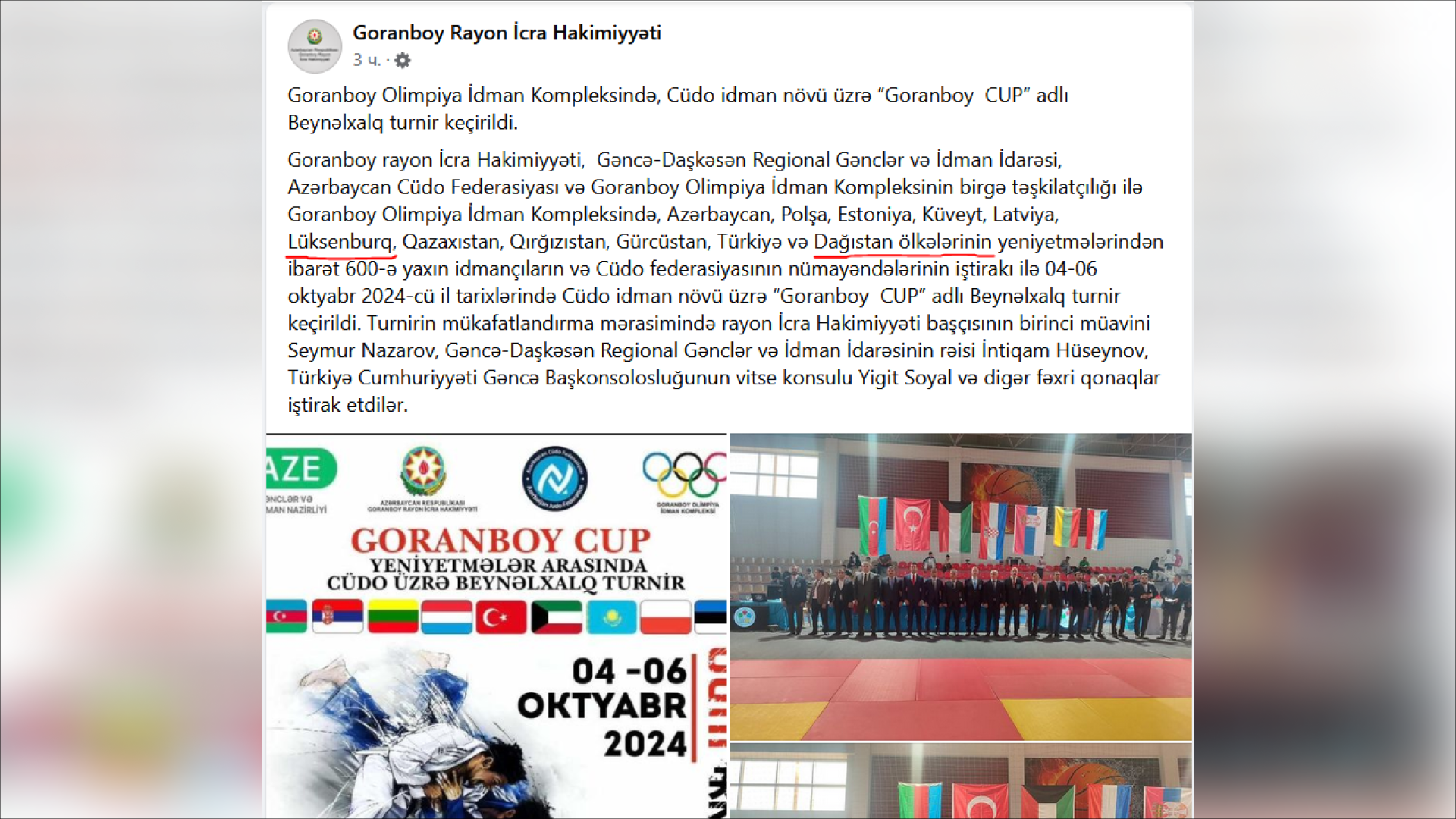 Təqdim etdiyimiz şəkildə Goranboy Rayon İcra Hakimiyyətinin (İH) “Facebook” səhifəsindəki “inciləri” seyr etmək mümkündür. Çox təəssüf ki, belə mötəbər qurumda hələ də bilmirlər ki, Dağıstan – ölkə deyil. Və yəqin anlamırlar ki, bu respublikanı dövlət kimi təqdim etmək bizim şimal qonşularımızı – Rusiyanı heç də sevindirməyəcək.