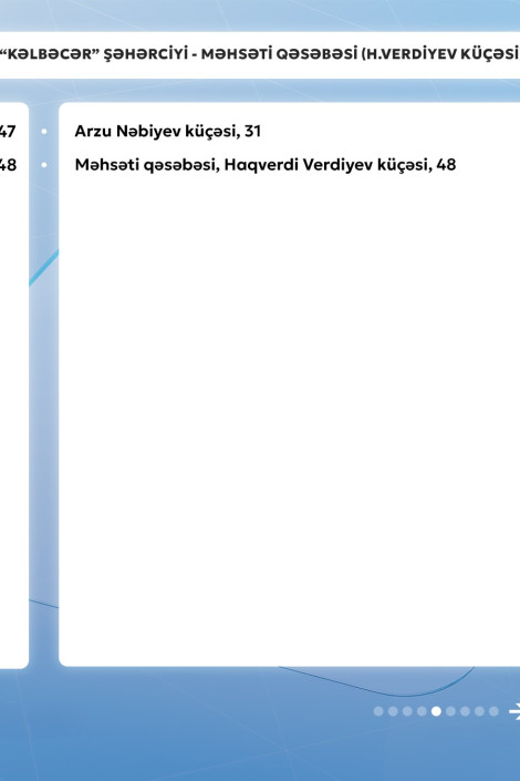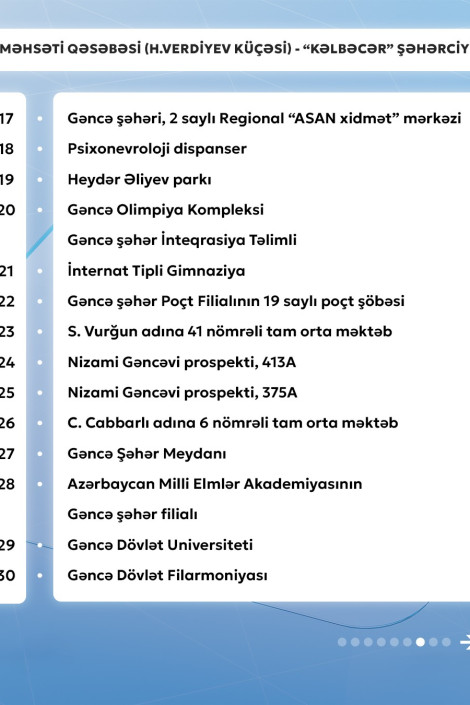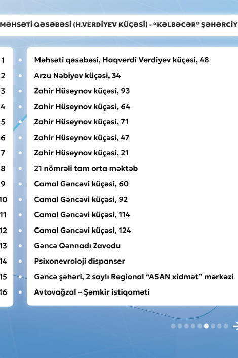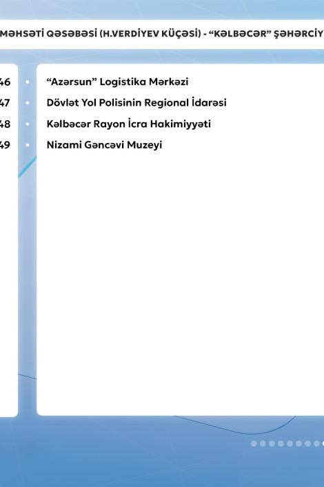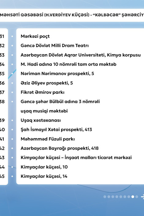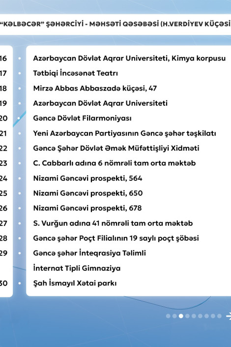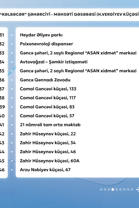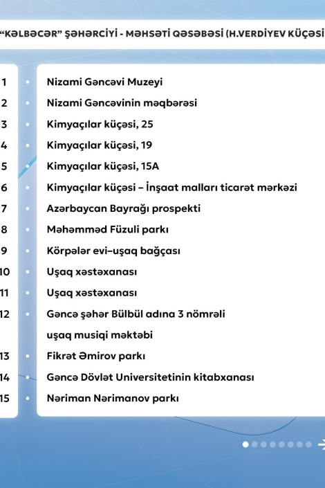 Gencexeber.az-a adıçəkilən sərnişindaşıma şirkətinin mətbuat xidmətindən verilən məlumata görə, 11 nömrəli müntəzəm marşrut xətti üzrə avtobuslar Məhsəti qəsəbəsi (H.Verdiyev küçəsi) - "Kəlbəcər" şəhərciyi istiqamətində və əksinə hər gün saat 06:30-dan 23:00-dək hərəkət edir.