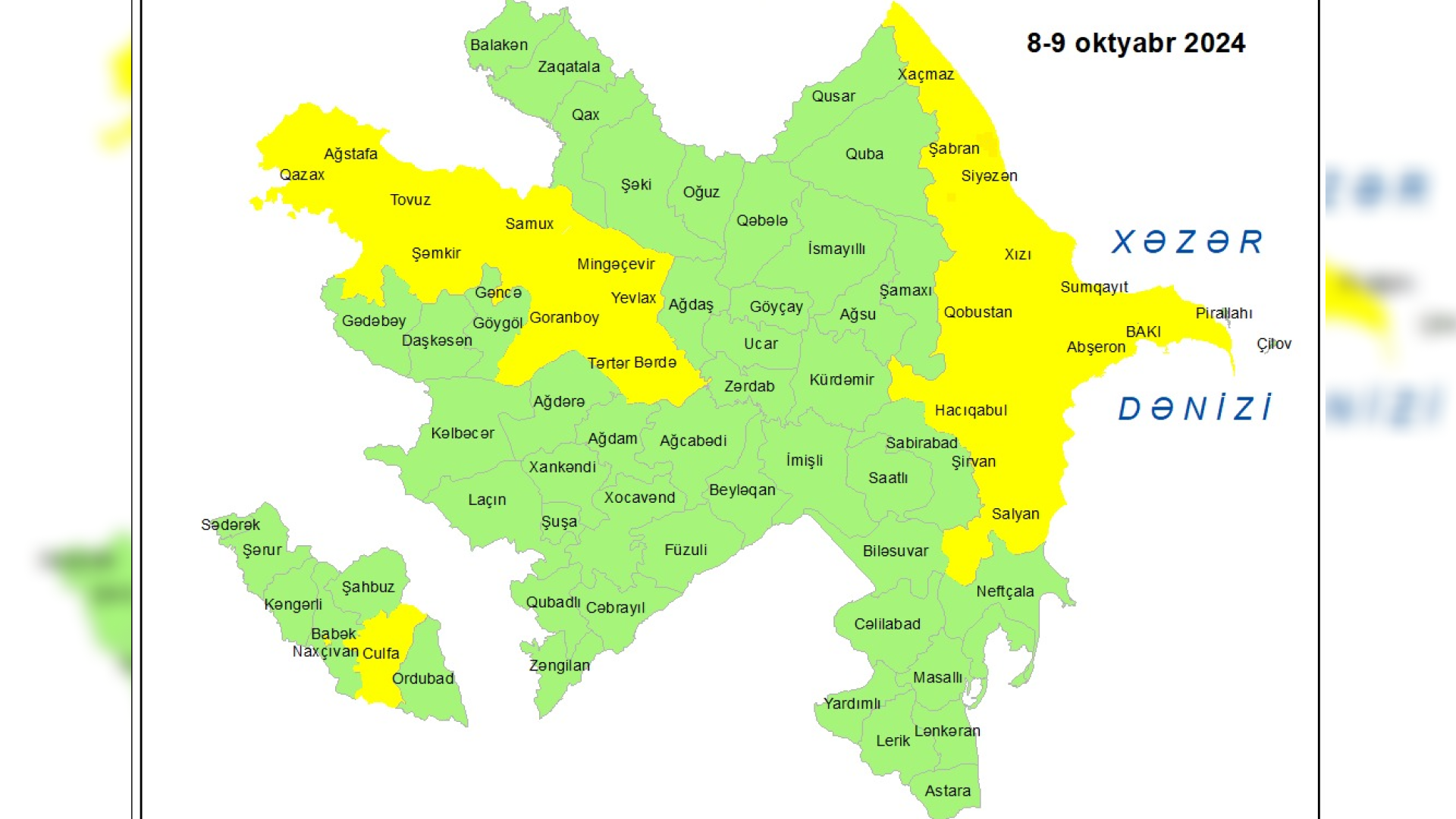 Gencexeber.az Milli Hidrometeorologiya Xidmətinə istinadən məlumat verir ki, ölkə ərazisində güclü külək əsəcək. Bu səbəbdən bir sıra rayonlar oktyabrın 8 və 9-u sarı xəbərdarlıq zonasına daxil edilib.
