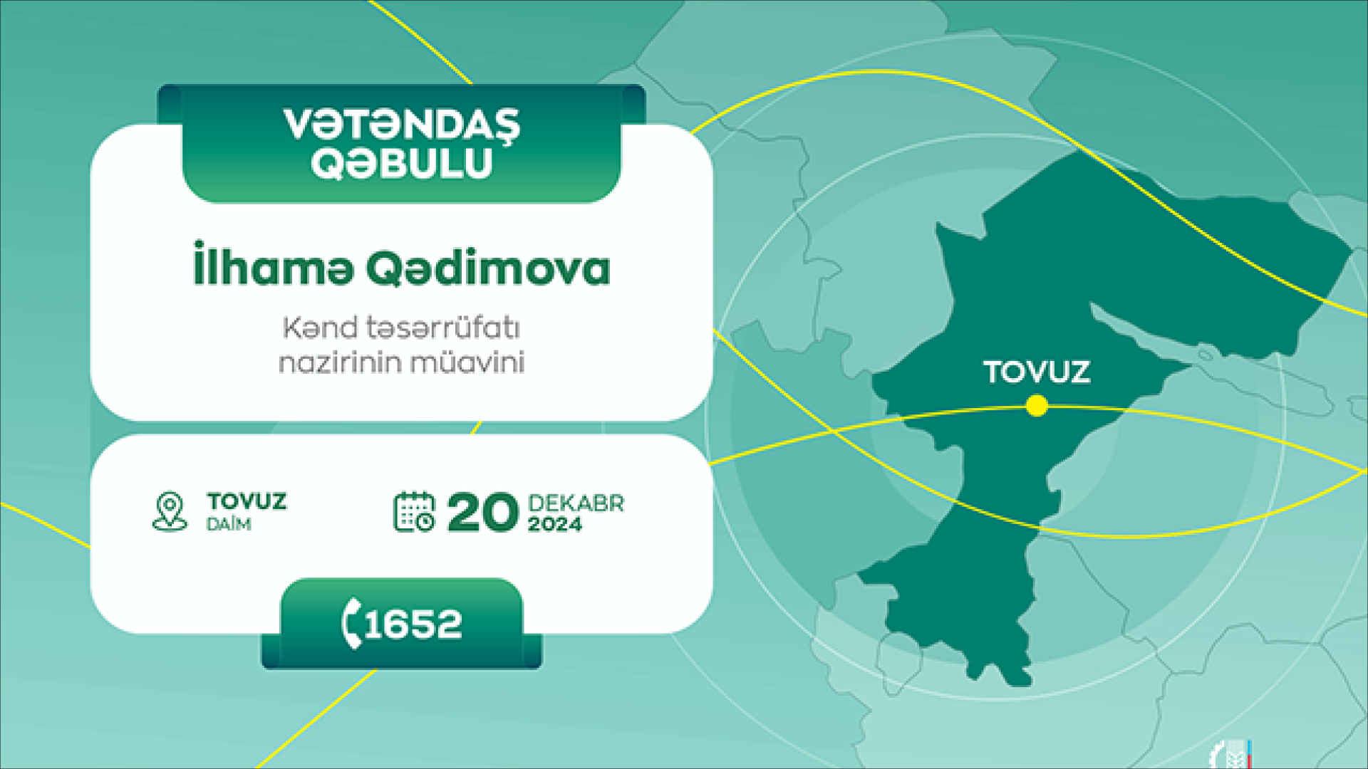 Kənd təsərrüfatı nazirinin müavini İlhamə Qədimova 20 dekabr saat 10:00-da Tovuz Dövlət Aqrar İnkişaf Mərkəzinin inzibati binasında vətəndaşları qəbul edəcək.