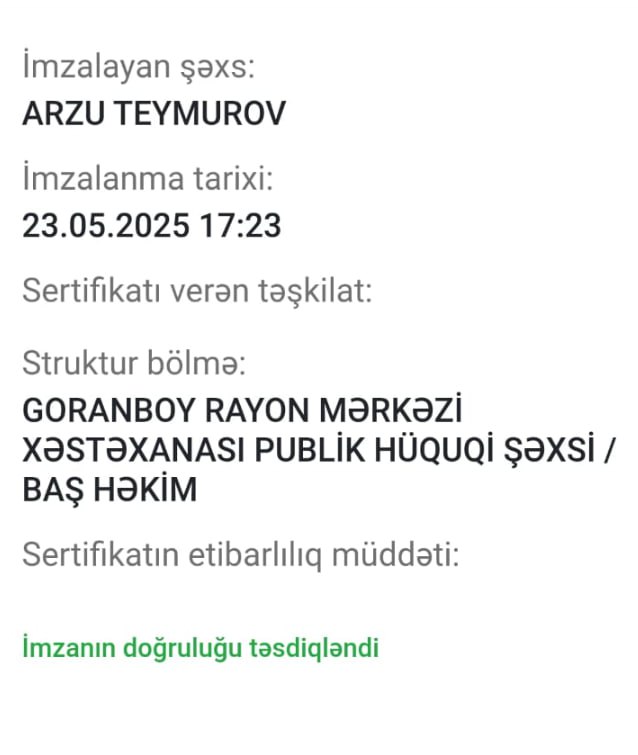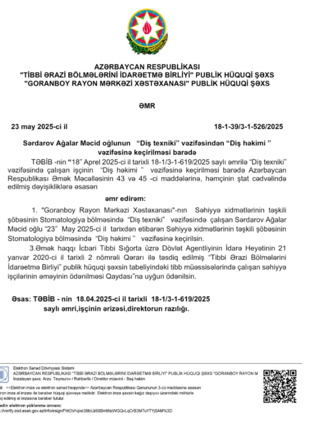 Sözügedən əmrin fotosu var. Əmri imzalayan şəxs Goranboy Rayon Mərkəzi Xəstəxanasının Baş Həkimi Arzu Teymurov, diş texniki vəzifəsindən diş həkimi vəzifəsinə keçirilən isə Sərdarov Ağalar Məcid oğludur.