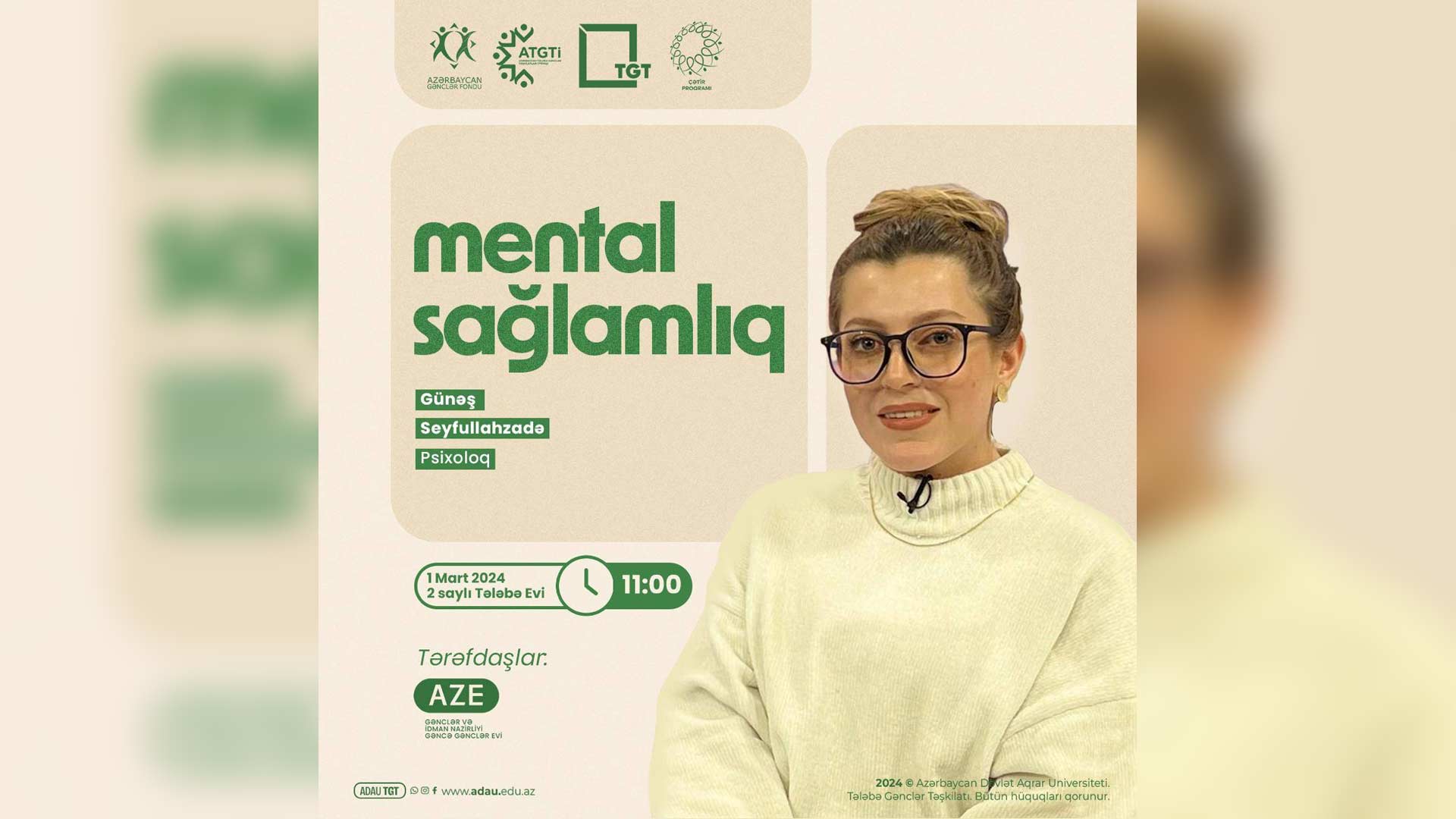 Tədbir “Çətir” proqramı çərçivəsində təşkil olunacaq. "Mental Sağlamlıq” adlı psixoloji seminar Azərbaycan Dövlət Aqrar Universiteti Tələbə Gənclər Təşkilatı, PsychoLife - psixologiya klubunun təşkilatçılığı və Gənclər Evinin dəstəyi ilə keçirilir.