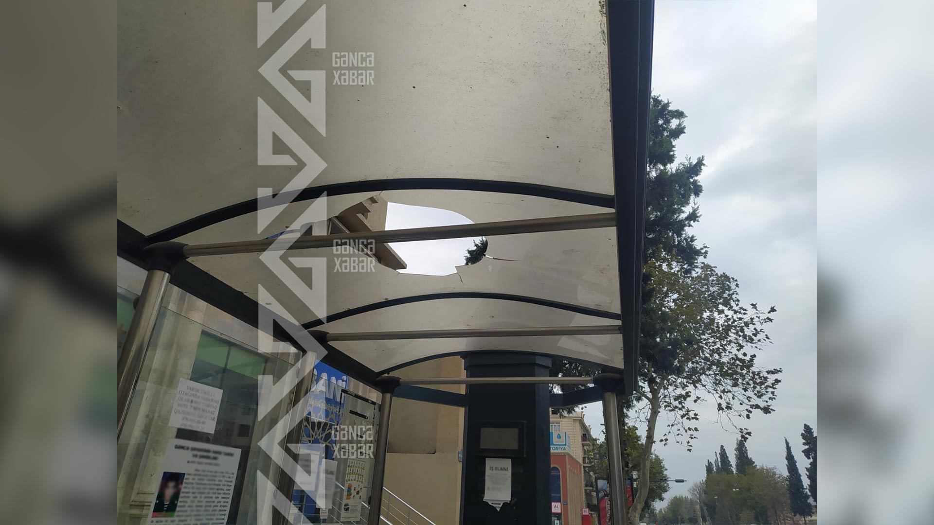 Sözügedən hal şəhərin Heydər Əliyev prospektində müşahidə edilir. Burada yerləşən dayanacaq pavilyonunun dam örtüyü yararsız hala düşüb. Plastik tavanın ortasında böyük dəlik açılıb.