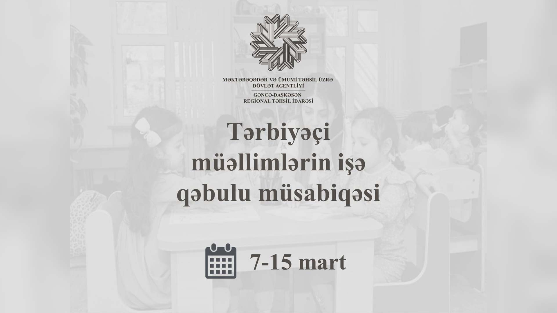 Məktəbəqədər təhsil müəssisələrində tərbiyəçi-müəllim tələb olunur. Namizədlər 7-15 mart tarixlərində saat 23:59-a kimi qeydiyyatdan keçə bilərlər. İştirak üçün minimal bal 35-dir.
