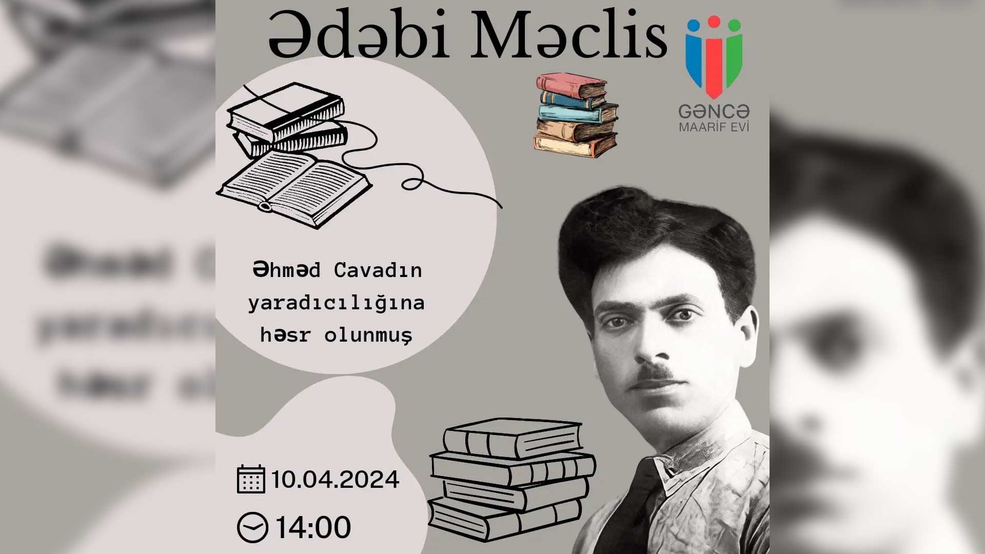 Söhbət ədəbi məclisdən gedir. Klub Gəncə Maarif Evində fəaliyyət göstərəcək. İlk tədbir 10 aprel tarixində saat 14:00-da baş tutacaq. Burada Əhməd Cavadın yaradıcılığından danışılacaq.