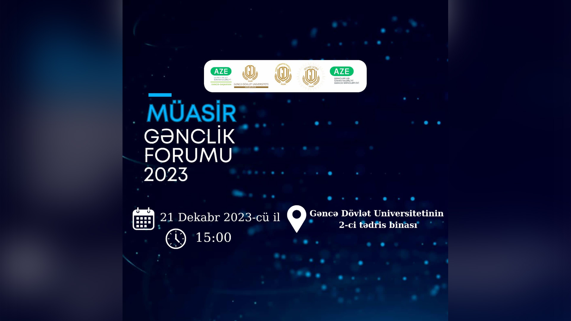 "Müasir Gənclik Forumu 2023" adlı tədbir təşkil olunacaq. Forum iki paneldən ibarət olacaq. Birinci hissədə "Spikerlərin çıxışı", ikinci hissədə isə gənclərlə iş üzrə seminar keçiriləcək. Tədbirin məqsədi gənclərimizə uğurlu karyera qurmaqda yardımçı olacaq lazımi bilik vermək və peşəkar kadr kimi yetişmələrinə kömək olmaqdır.