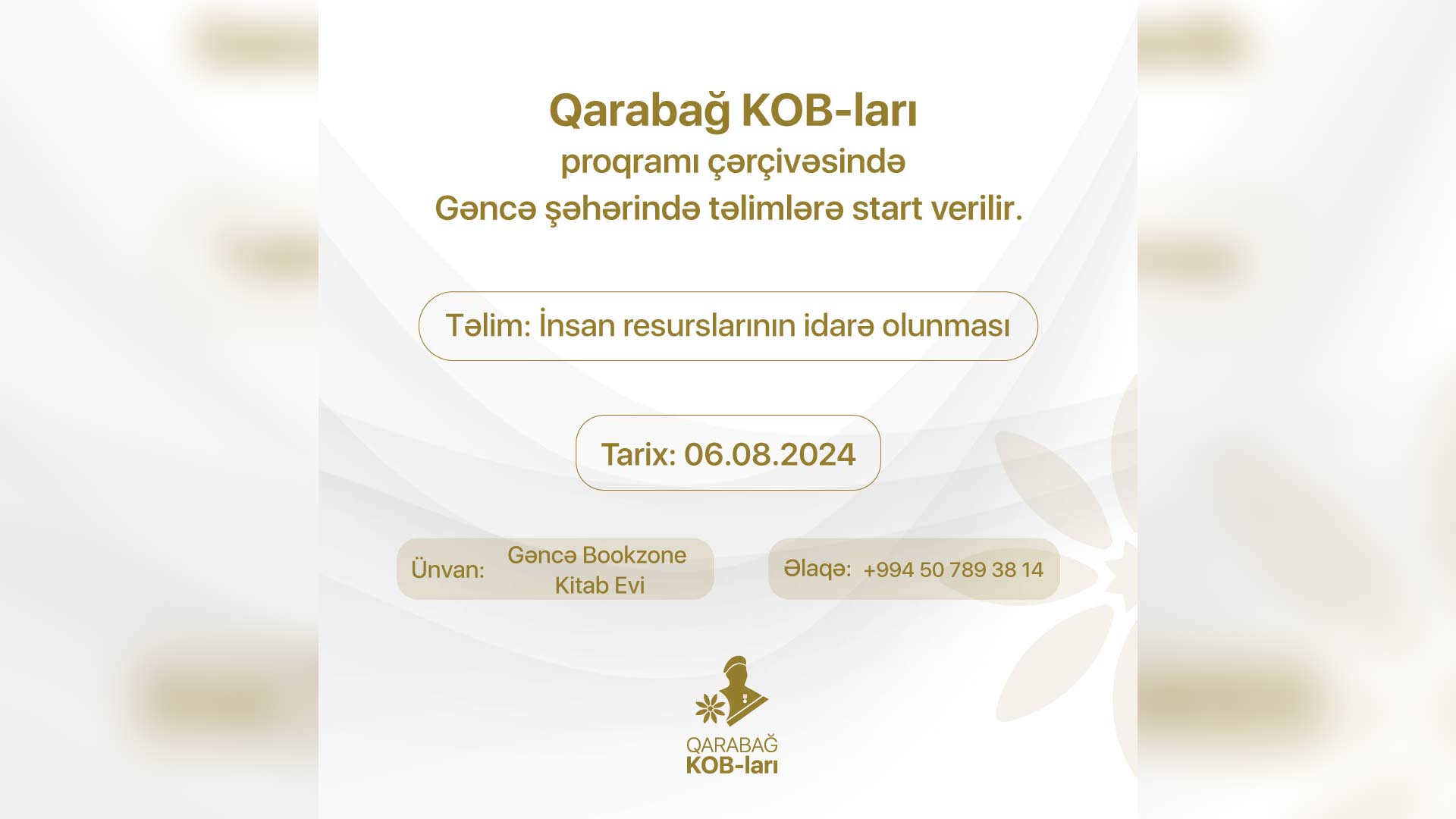 Təlim “İnsan resurslarının idarə olunması” mövzusunda Qarabağ KOB-ləri proqramı çərçivəsində keçiriləcək. Toplantılar aşağıdakı mövzuları əhatə edəcək: