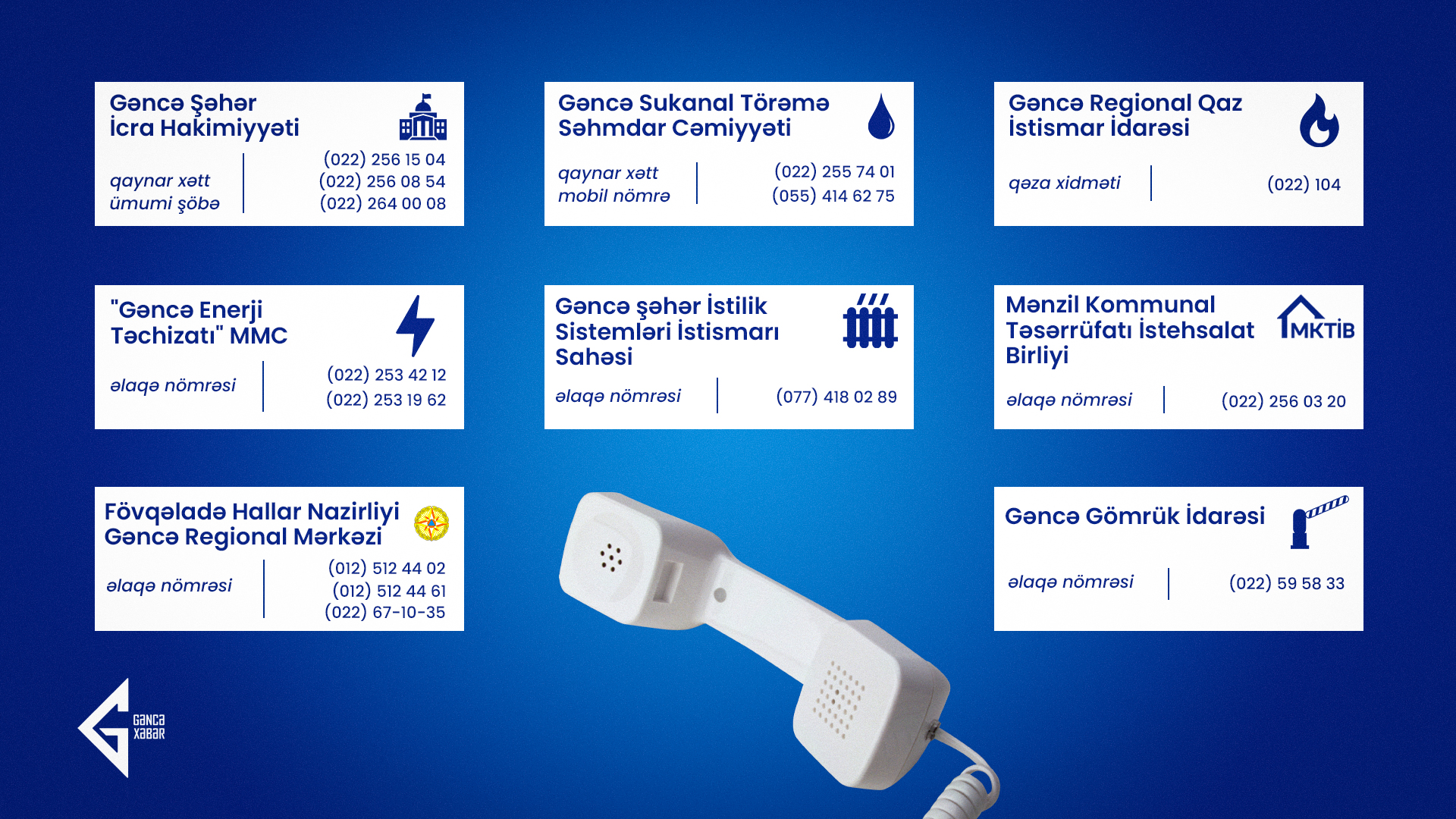 Bayram günlərində bir sıra qurumlar tətilə çıxır. Bu səbəbdən vətəndaşlar hər hansı problemlə bağlı hara müraciət etməli olduqlarını bilmirlər. Gəncəxəbər.az redaksiyası olaraq, Gəncədə fəaliyyət göstərən əsas qurumların “Qaynar xətt”lərini və əlaqə nömrələrini toplayaraq oxucularımıza təqdim edirik.