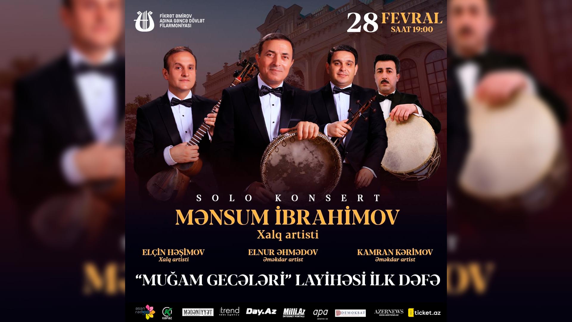 Gəncə Dövlət Filarmoniyasında 28 fevral saat 19:00-da “Muğam gecələri” keçiriləcək. Burada Azərbaycan Respublikasının Xalq artisti, "Şöhrət" və "Şərəf" ordenli professor Mənsum İbrahimovun solo konserti təqdim olunacaq. Xanəndəni tarda Xalq artisti Elçin Həşimov, kamançada Əməkdar artist "Tərəqqi" medallı Elnur Əhmədov və nağarada Əməkdar artist Kamran Kərimov müşayiət edəcəklər.