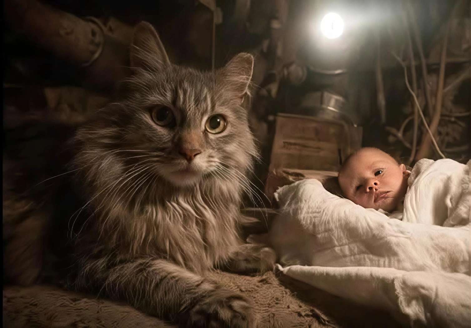 Tərk edilmiş körpəni binanın zirzəmisində digər heyvanların hücumundan pişik qoruyub.